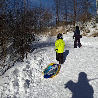 その後、ソリを練習しました。リフトに乗って、バンビコースの頂上からも滑ることができますし、